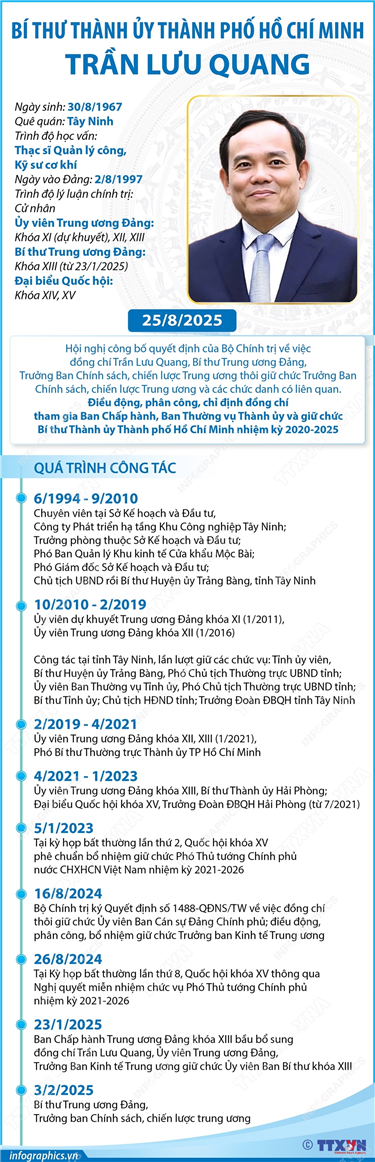 Tin cùng chuyên mục Bí thư Thành ủy Thành phố Hồ Chí Minh Trần Lưu Quang26/08/2025 15:22Hà Nội (TTXVN 25/8) Sáng 25/8/2025, Thành ủy Thành phố Hồ Chí Minh tổ chức Hội nghị công bố quyết định của Bộ Chính trị về công tác cán bộ. Theo Quyết định của Bộ Chính trị, đồng chí Trần Lưu Quang, Bí thư Trung ương Đảng, Trưởng Ban Chính... Ban Bí thư chỉ đạo ứng phó với cơn bão số 5 (Kajiki)25/08/2025 15:21Hà Nội (TTXVN 24/8) Ngày 23/8/2025, Ủy viên Bộ Chính trị, Thường trực Ban Bí thư Trần Cẩm Tú đã ký ban hành Công văn số 70-CV/TW của Ban Bí thư về việc ứng phó với cơn bão số 5 (tên quốc tế là Kajiki). Công văn gửi: Các tỉnh ủy,... Nhiều kết quả quan trọng sau gần 2 tháng vận hành chính quyền địa phương 2 cấp25/08/2025 15:20Hà Nội (TTXVN 24/8) Hai tháng triển khai vận hành chính quyền địa phương theo mô hình 2 cấp, đến nay cơ bản “thuận buồm, xuôi gió”, đang đi vào ổn định, thể hiện sự nỗ lực của cả hệ thống chính trị; đáp ứng đúng, trúng với nguyện vọng của nhân... Nền tảng số “A80 - Tự hào Việt Nam”: Hỗ trợ tra cứu chuỗi hoạt động dịp Quốc khánh25/08/2025 15:19Hà Nội (TTXVN 23/8) Sau khi Hà Nội chính thức đưa vào sử dụng ứng dụng “A80 - Tự hào Việt Nam” để phục vụ người dân tra cứu thông tin lễ kỷ niệm, diễu binh, diễu hành 80 năm Cách mạng Tháng Tám thành công và Quốc khánh 2/9, hàng... Chính phủ dưới sự lãnh đạo của Đảng 80 năm hành trình vì nước, vì dân25/08/2025 15:18Hà Nội (TTXVN 20/8) Nhìn lại lịch sử 80 năm của Chính phủ qua các giai đoạn đầy cam go, thử thách nhưng cũng rất vẻ vang, vinh dự, tự hào của Cách mạng Việt Nam, dưới sự lãnh đạo của Trung ương Đảng, của Chủ tịch Hồ Chí Minh kính yêu, thường xuyên trực tiếp... 34/34 địa phương trên cả nước đã cơ bản hoàn thành mục tiêu xóa bỏ nhà tạm, nhà dột nát20/08/2025 15:04Hà Nội (TTXVN 19/8) Với 334.234 căn nhà được xây mới và sửa chữa, về đích sớm trước 5 năm 4 tháng so với mục tiêu Nghị quyết 42-NQ/TW, ngày 24/11/2023 của Ban Chấp hành Trung ương Đảng khóa XIII đề ra, phong trào cả nước chung tay xóa nhà tạm, nhà dột...