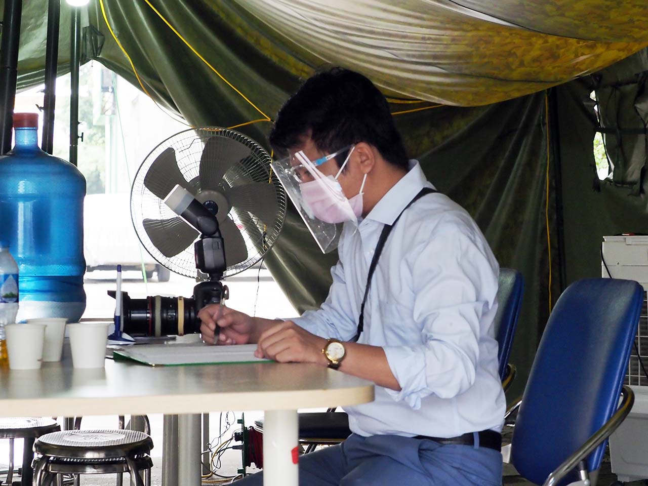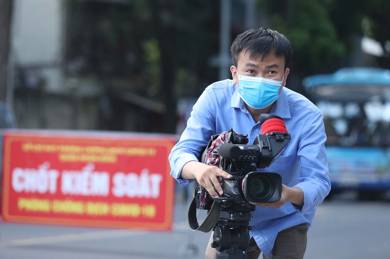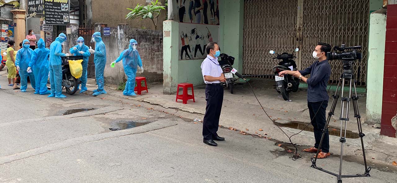 | Phóng viên Giáp Công, Truyền hình Thông tấn tại TP. Hồ Chí Minh, phỏng vấn cán bộ và nhân viên y tế đang thực hiện lấy mẫu xét nghiệm COVID-19 lưu động tại tâm dịch TP. Thủ Đức, tháng 7/2021 |