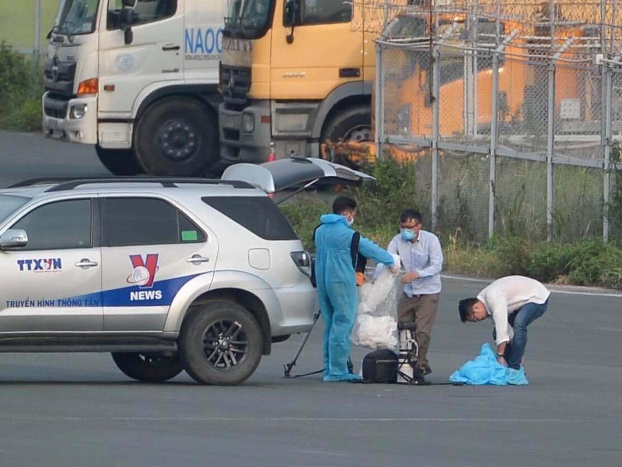 | Phóng viên Truyền hình Thông tấn và Ban biên tập Ảnh thu dọn đồ bảo hộ sau khi tác nghiệp tại sân bay Nội Bài, Hà Nội |