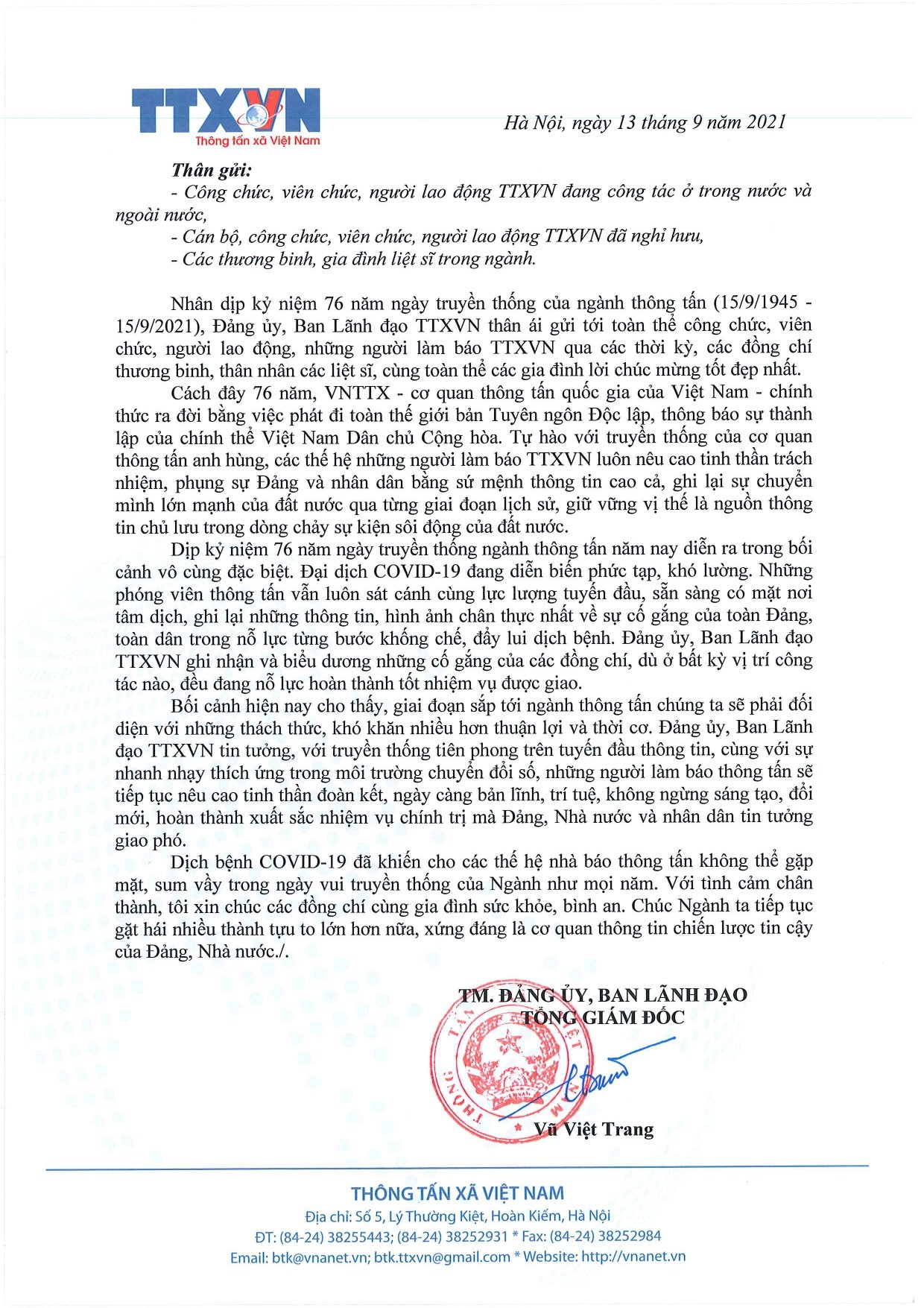 Sự kiện và kỷ niệmTin trong ngành Thư chúc mừng của Tổng giám đốc Vũ Việt Trang nhân kỷ niệm 76 năm ngày truyền thống TTXVN Thứ ba, 14/09/2021 08:04 Nhân dịp kỷ niệm 76 năm ngày truyền thống của ngành Thông tấn (15/9/1945-15/9/2021), thay mặt Đảng ủy, Ban lãnh đạo TTXVN, Tổng giám đốc Vũ Việt Trang đã gửi thư chúc mừng tới toàn thể công chức, viên chức, người lao động, những người làm báo TTXVN qua các thời kỳ, các đồng chí thương binh, thân nhân các liệt sỹ cùng toàn thể gia đình. Nội san Thông tấn