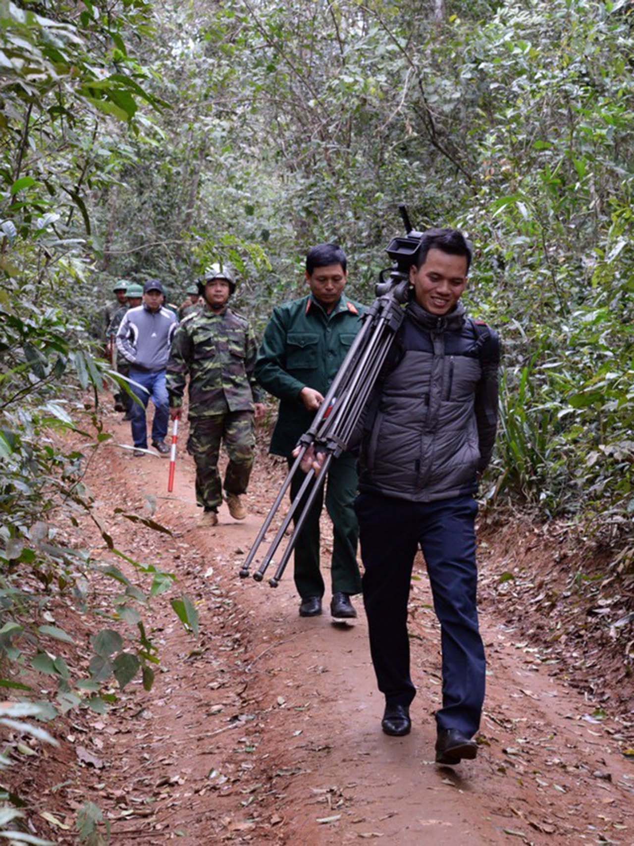 | Phóng viên CQTT TTXVN tại Đắk Nông Mai Hưng Thịnh cùng cán bộ chiến sỹ Đoàn kinh tế quốc phòng Quảng Sơn trong chuyến công tác tại huyện Đắk Glong, tỉnh Đắk Nông |