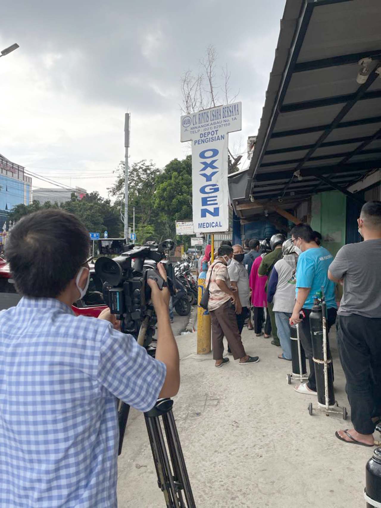 | Trưởng CQTT TTXVN tại Jakarta Nguyễn Hữu Chiến ghi hình một điểm phân phối oxy giữa cao điểm làn sóng lây lan dịch thứ hai tại Thủ đô Jakarta, Indonesia |
