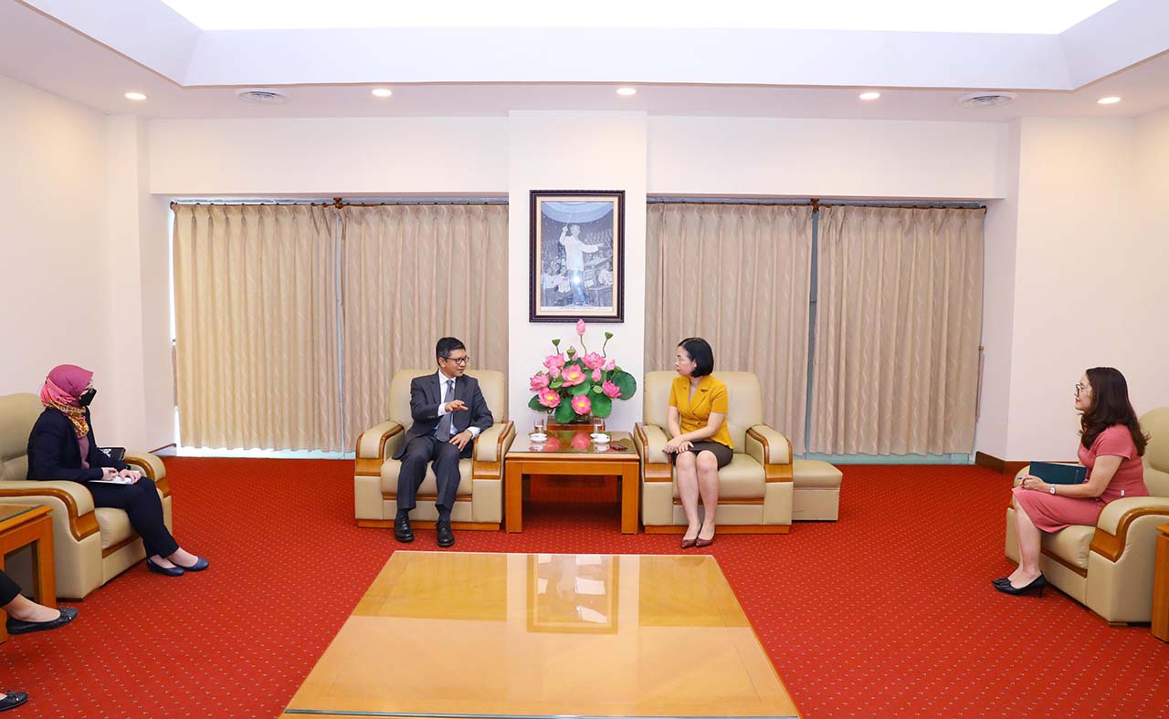 | Tổng giám đốc TTXVN Vũ Việt Trang tiếp Đại sứ đặc mệnh toàn quyền Cộng hòa Indonesia Denny Abdi, ngày 7/10/2021 |