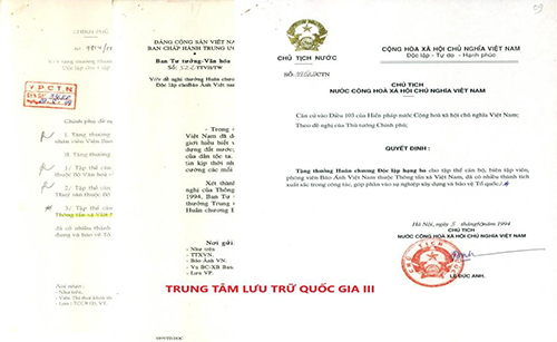 | Quyết định số 345/QĐ-CTN ngày 3/10/1994 của Chủ tịch nước về việc khen thưởng Huân chương Độc lập hạng Ba cho tập thể cán bộ, biên tập viên, phóng viên Báo ảnh Việt Nam. Nguồn: Trung tâm Lưu trữ quốc gia III, Phông Văn phòng Chủ tịch nước, hồ sơ 1243, tờ 07-09 |