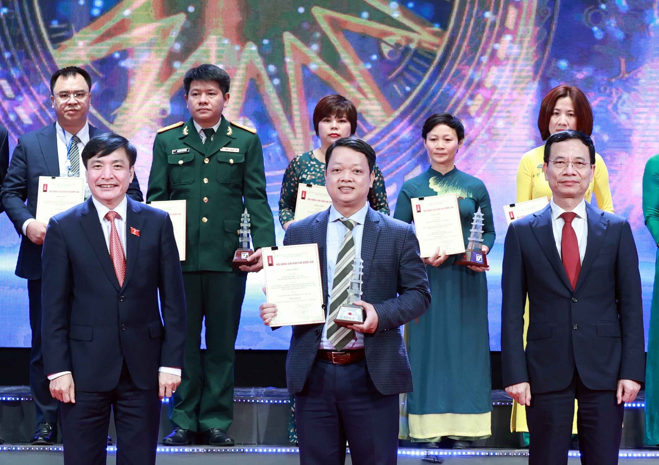 | Ban tổ chức trao giải B cho tác giả Bùi Doãn Tấn, đại diện nhóm tác giả Ban biên tập Ảnh TTXVN, với tác phẩm “Cả hệ thống chính trị vào cuộc, toàn dân đồng lòng chống dịch COVID-19” |