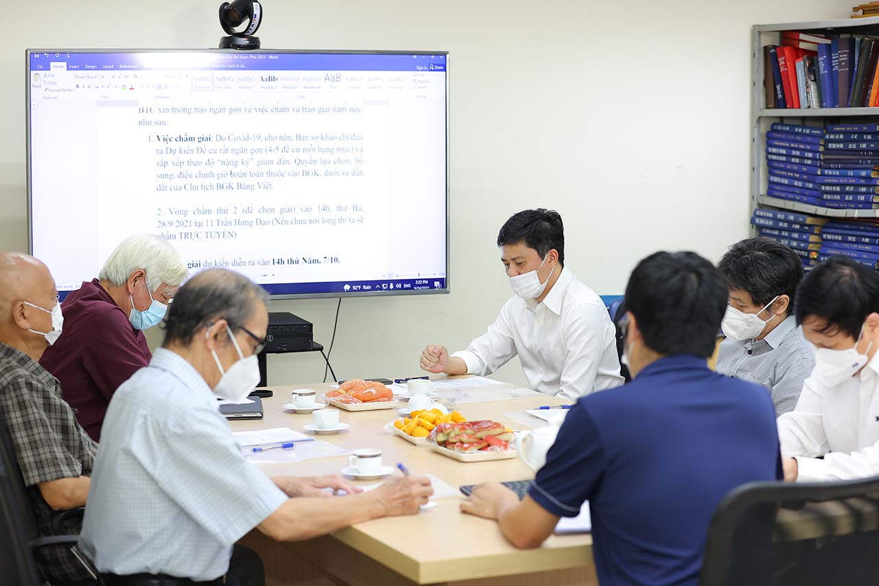 | Hội đồng giám khảo Giải Bùi Xuân Phái - Vì tình yêu Hà Nội lần 14 năm 2021 trong phiên làm việc |