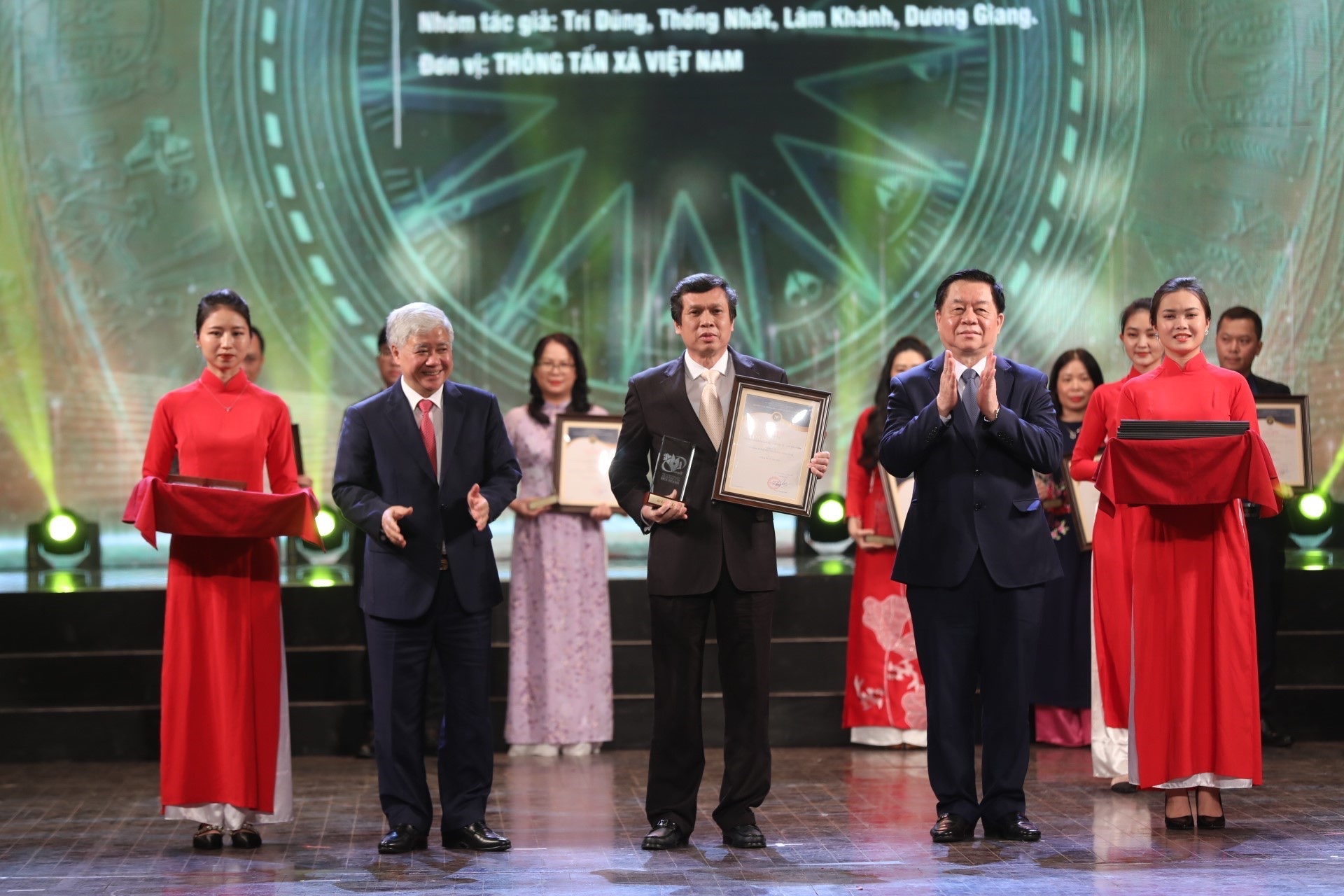 | Bí thư Trung ương Đảng, Trưởng ban Tuyên giáo Trung ương Nguyễn Trọng Nghĩa và Chủ tịch Ủy ban Trung ương Mặt trận Tổ quốc Việt Nam Đỗ Văn Chiến trao giải Nhất cho các tác giả, nhóm tác giả đoạt giải |