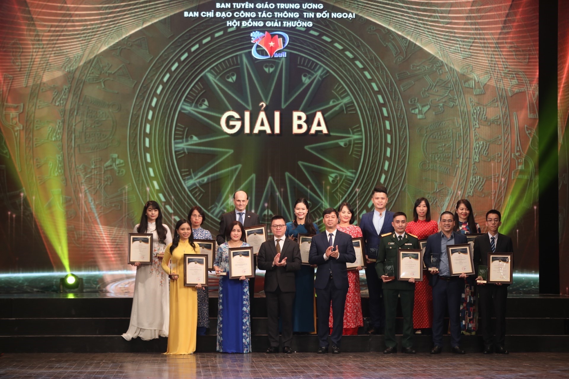 | Tổng biên tập báo Nhân dân Lê Quốc Minh và Phó tổng giám đốc Đài Tiếng nói Việt Nam Ngô Minh Hiển trao giải Ba cho các tác giả, nhóm tác giả đoạt giải |