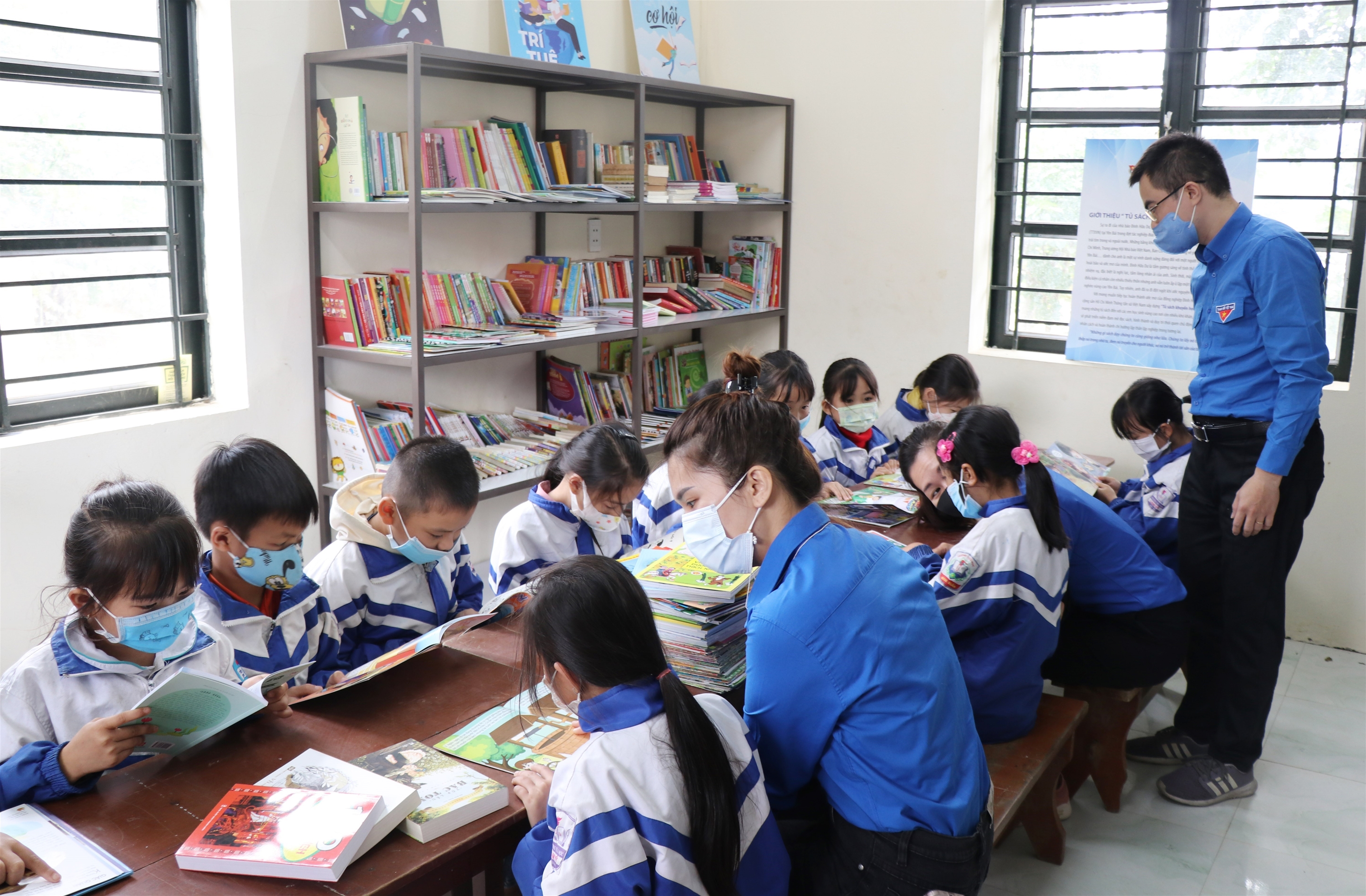 | Các em học sinh điểm trường Văn La say sưa bên những trang sách còn thơm mùi mực - món quà của Đoàn thanh niên TTXVN |
