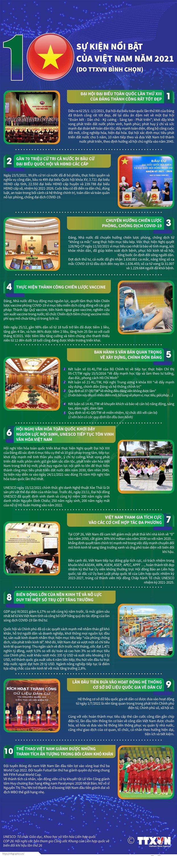 Trong số những sự kiện nổi bật của Việt Nam năm 2021 do TTXVN bình chọn, Đại hội đại biểu toàn quốc lần thứ XIII của Đảng thành công tốt đẹp là sự kiện số 1. Tiếp đến là một số sự kiện: gần 70 triệu cử tri cả nước đi bầu cử đại biểu Quốc hội và HĐND các cấp; chuyển hướng chiến lược phòng, chống dịch COVID-19; thực hiện thành công chiến lược vaccine; ban hành 5 văn bản quan trọng về xây dựng, chỉnh đốn Đảng...