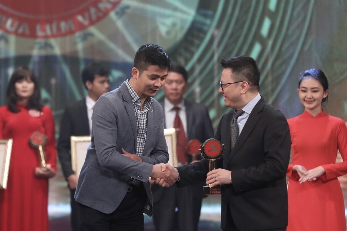 | Tổng biên tập báo Nhân Dân, Chủ tịch Hội Nhà báo Việt Nam Lê Quốc Minh trao giải Khuyến khích cho đại diện nhóm tác giả Ban biên tập Ảnh TTXVN |