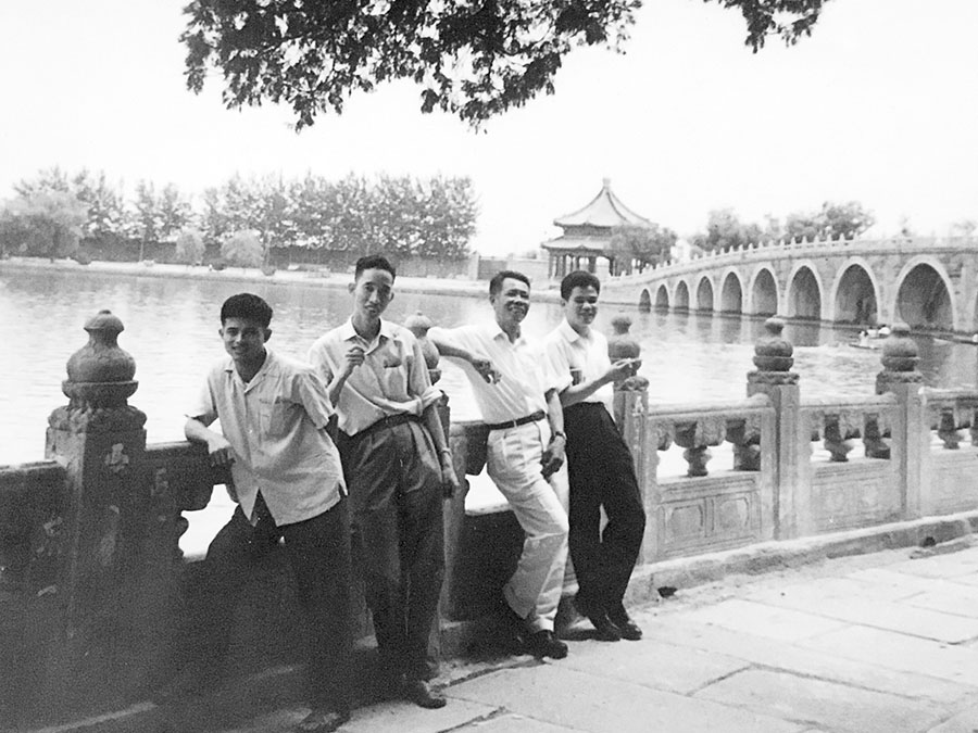 | Từ trái qua: Hai phóng viên Phân xã Bắc Kinh Đỗ Chuyên và Lê Tư Vinh, một cán bộ sứ quán và ông Võ Nhân Lý (lúc đó là biên tập viên tiếng Việt của Đài Phát thanh quốc gia Trung Quốc, sau này là Phó tổng giám đốc TTXVN) tại Bắc Kinh, Trung Quốc, giai đoạn 1954-1957 |