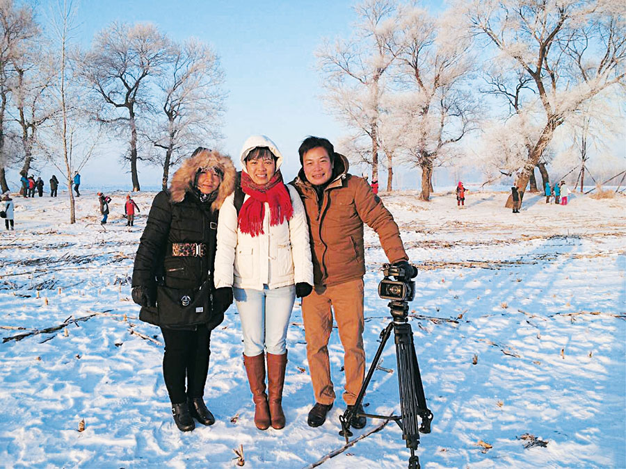 | Nhóm phóng viên CQTT tại Bắc Kinh, Trung Quốc (từ trái qua) Phạm Hải Yến, Hà Thị Tường Thu và Lê Trung Kiên, tại tỉnh Cát Lâm, năm 2017 |