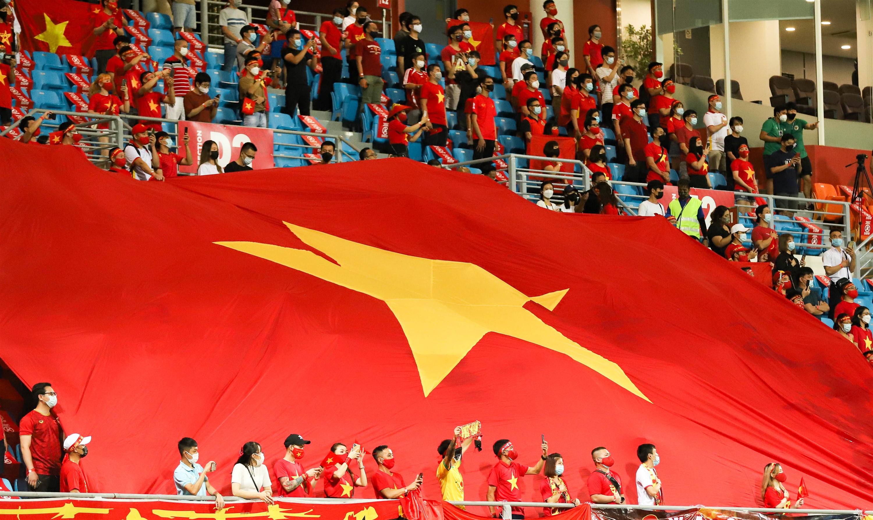 Lá Quốc kỳ cỡ lớn của các cổ động viên Việt Nam tại giải bóng đá AFF Cup 2020 tại Singapore, tháng 12/2021