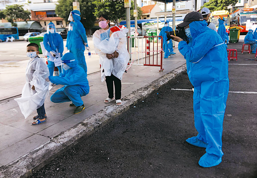 | Phóng viên Mạnh Linh, báo Tin tức, tác nghiệp tại bến xe miền Đông (quận Bình Thạnh, TP. Hồ Chí Minh) trong thời điểm giãn cách xã hội |