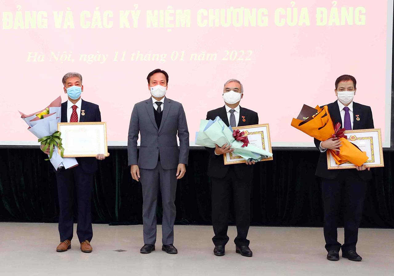| Đồng chí Lại Xuân Lâm, Phó Bí thư Đảng ủy Khối các Cơ quan Trung ương trao tặng Huy hiệu 30 năm tuổi Đảng cho các các đồng chí: nguyên Phó tổng giám đốc Nguyễn Hoài Dương; nguyên Trưởng ban Tổ chức-Cán bộ Lê Quang Sơn; đảng viên Nguyễn Xuân Lộc, Đảng bộ Trung tâm Kỹ thuật Thông tấn |