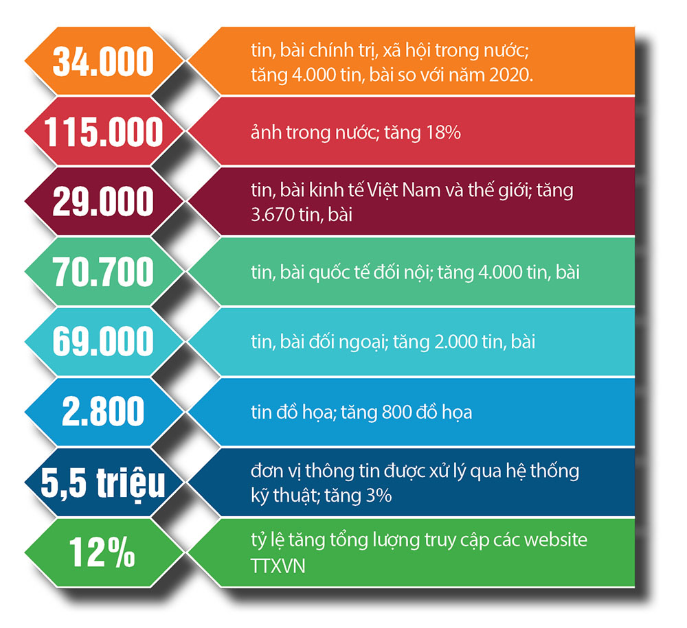 Công tác chỉ đạo, tổ chức thông tin toàn ngành tiếp tục đổi mới, thể hiện tính chuyên nghiệp, khoa học, chặt chẽ và linh hoạt; phát huy sức mạnh toàn ngành hoàn thành tốt các đợt thông tin về Đại hội lần thứ XIII của Đảng, bầu cử Quốc hội khóa XV và HĐND các cấp, tuyến thông tin lan tỏa bài viết của Tổng Bí thư Nguyễn Phú Trọng về “Một số vấn đề lý luận và thực tiễn về chủ nghĩa xã hội và con đường đi lên chủ nghĩa xã hội ở Việt Nam”, khẳng định vai trò truyền thông chủ lực của cơ quan thông tấn quốc gia.