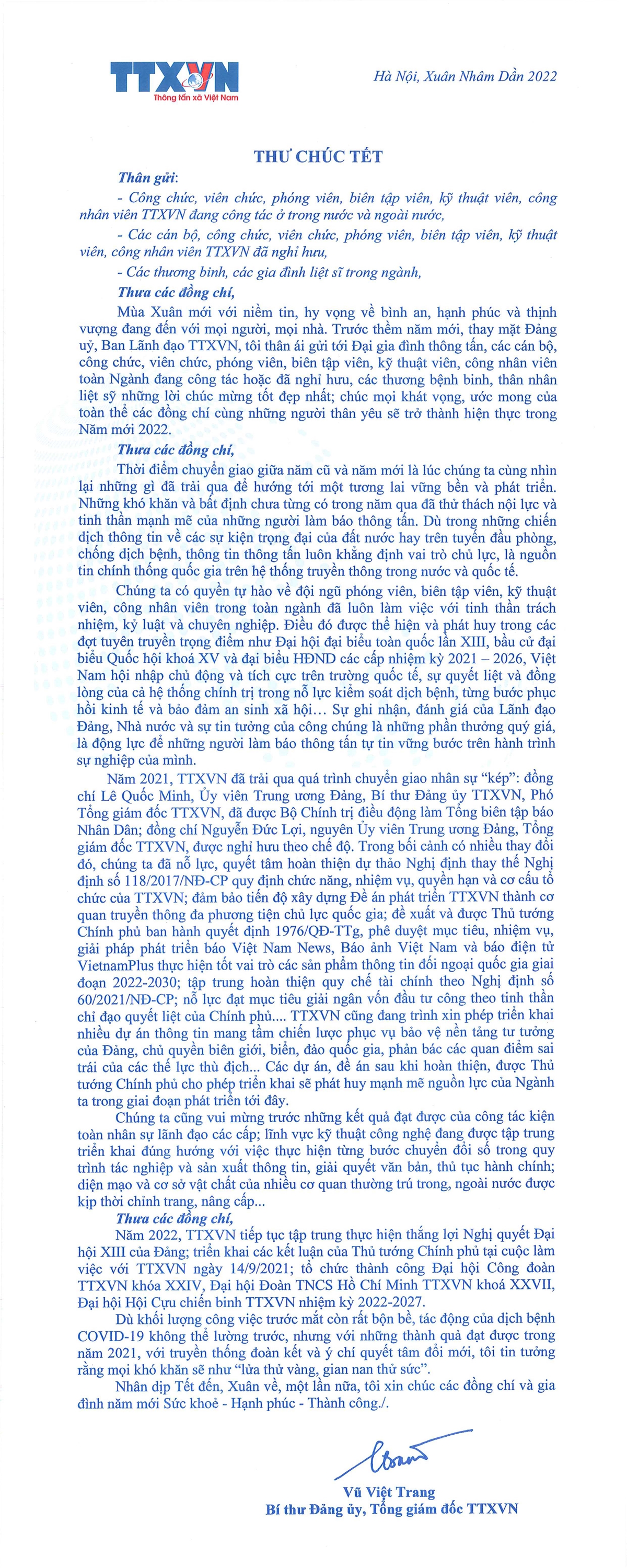 Sự kiện và kỷ niệmTin trong ngành Thư chúc Tết Nhâm Dần 2022 của Tổng giám đốc Vũ Việt Trang Thứ năm, 27/01/2022 09:45 Nhân dịp Tết nguyên đán Nhâm Dần 2022 , Tổng giám đốc Thông tấn xã Việt Nam (TTXVN) Vũ Việt Trang đã gửi thư chúc Tết đến toàn thể cán bộ, công chức, viên chức, phóng viên, biên tập viên, kỹ thuật viên, công nhân viên TTXVN đang công tác hoặc đã nghỉ hưu, các đồng chí thương binh, thân nhân liệt sĩ, cùng toàn thể các gia đình. Nội san Thông tấn số Xuân 2022