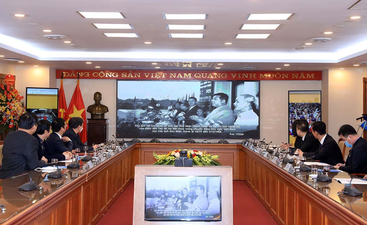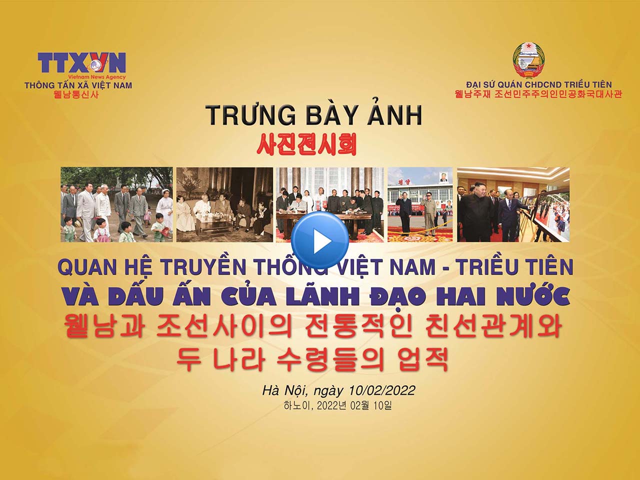 Ngày 10/2, tại Hà Nội, Thông tấn xã Việt Nam (TTXVN) phối hợp với Đại sứ quán Cộng hòa Dân chủ Nhân dân Triều Tiên tại Việt Nam tổ chức khai mạc trưng bày ảnh với chủ đề “Quan hệ truyền thống Việt Nam - Triều Tiên và dấu ấn của lãnh đạo hai nước”, nhân kỷ niệm 72 năm thiết lập quan hệ ngoại giao giữa Việt Nam và Triều Tiên, 65 năm cuộc gặp gỡ đầu tiên giữa Chủ tịch Hồ Chí Minh và Chủ tịch Kim Nhật Thành.