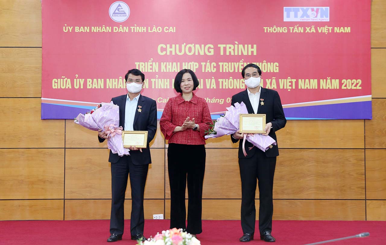 Dịp này, TTXVN đã trao Kỷ niệm chương “Vì sự nghiệp Thông tấn” tặng Bí thư Tỉnh ủy Lào Cai Đặng Xuân Phong và Chủ tịch UBND tỉnh Lào Cai Trịnh Xuân Trường vì đã có đóng góp xứng đáng cho sự nghiệp phát triển của TTXVN. UBND tỉnh Lào Cai tặng Bằng khen cho hai cá nhân có thành tích xuất sắc trong công tác tuyên truyền, quảng bá hình ảnh tỉnh Lào Cai năm 2021./.