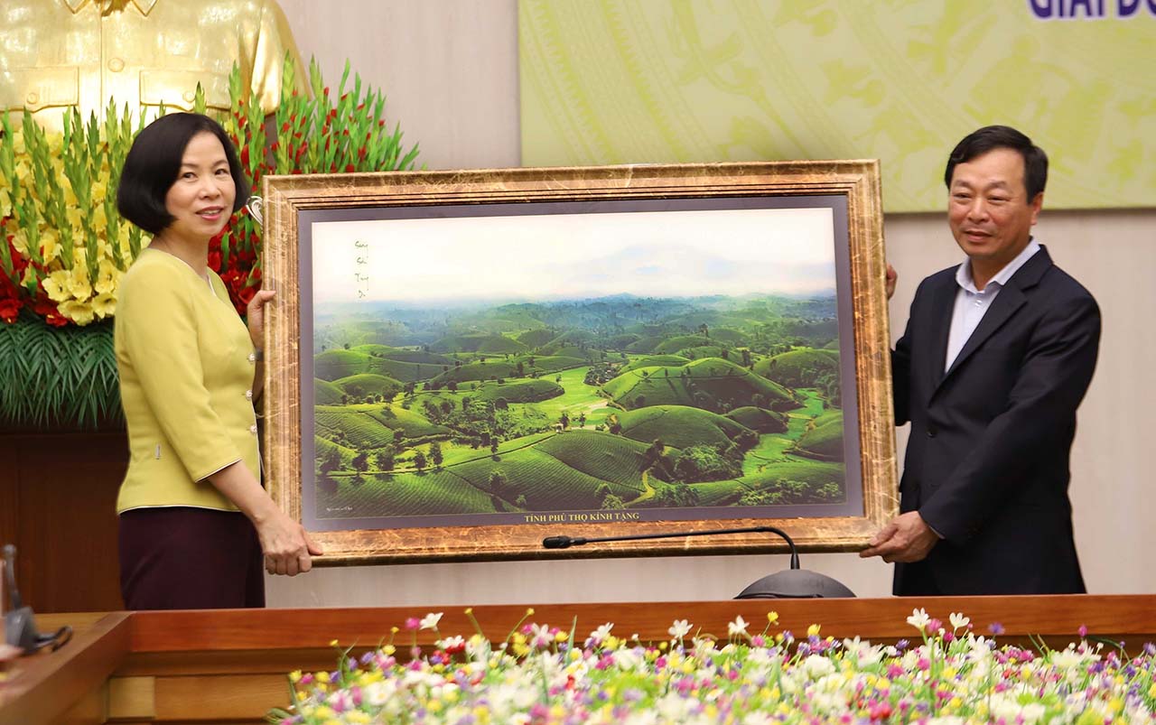 | Chủ tịch UBND tỉnh Phú Thọ Bùi Văn Quang trao bức ảnh Đồi chè Long Cốc tặng Tổng giám đốc TTXVN Vũ Việt Trang |