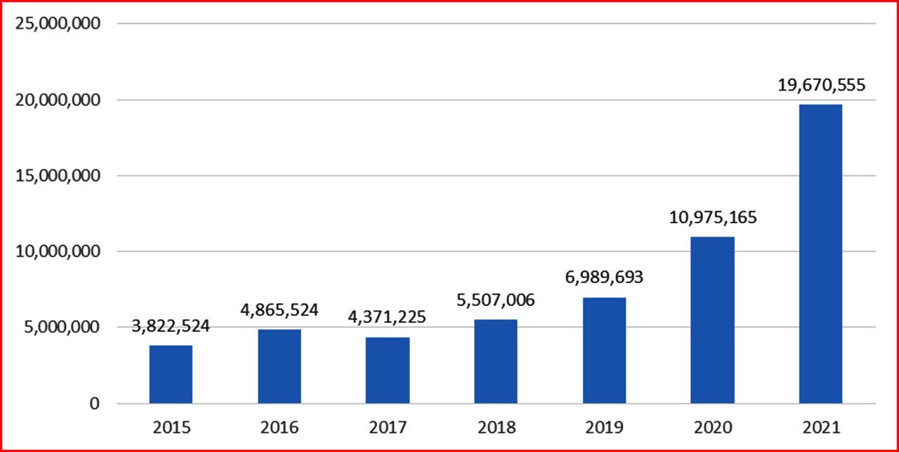 | Tổng lượng truy cập trên 5 trang ngữ của Ban biên tập tin Đối ngoại, giai đoạn 2015-2021 (theo Google Analytics) |