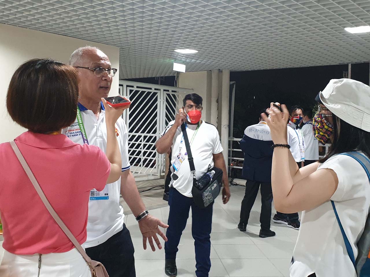 | Nhóm phóng viên Ban biên tập tin Đối ngoại phỏng vấn trọng tài quốc tế môn Kickboxing Mostafa El Rhannam sau lễ khai mạc tại SVĐ Mỹ Đình, tối 12/5 |