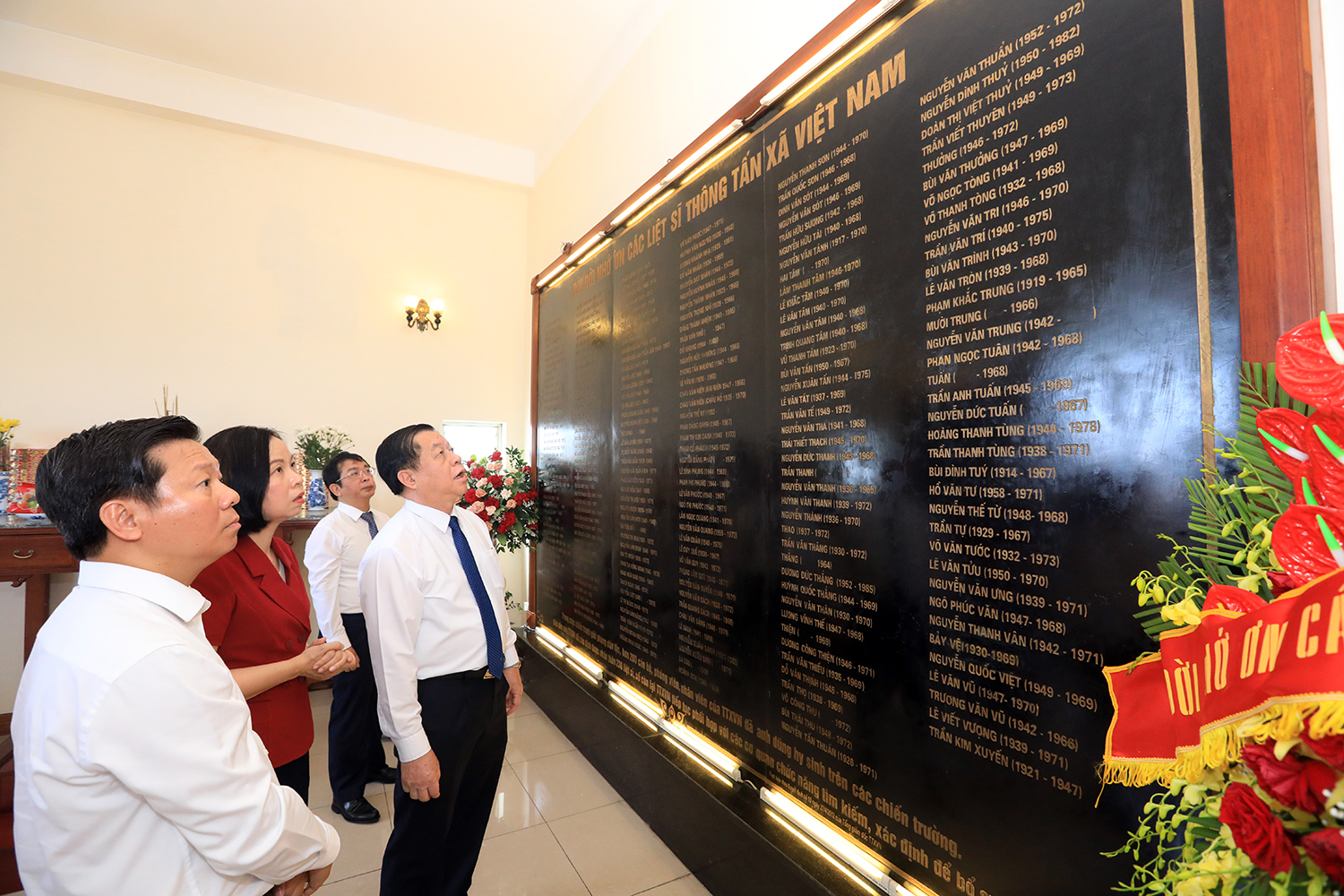 Bí thư Trung ương Đảng, Trưởng Ban Tuyên giáo Trung ương Nguyễn Trọng Nghĩa cùng Ban lãnh đạo TTXVN tham quan Nhà bia liệt sỹ, Trung tâm Thông tấn quốc gia, Hà Nội