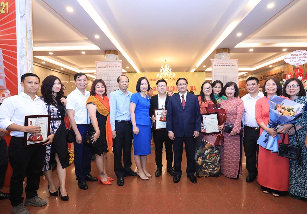 | Thủ tướng Chính phủ Phạm Minh Chính, Tổng giám đốc TTXVN Vũ Việt Trang cùng các phóng viên TTXVN vừa được trao Giải báo chí quốc gia năm 2021 |