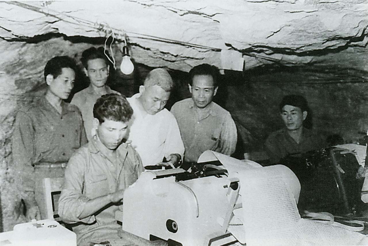 | Tổng biên tập VNTTX Đào Tùng tại cơ sở thu phát Teletype của Thông tấn xã Lào (KPL) thời kỳ kháng chiến chống Mỹ |
