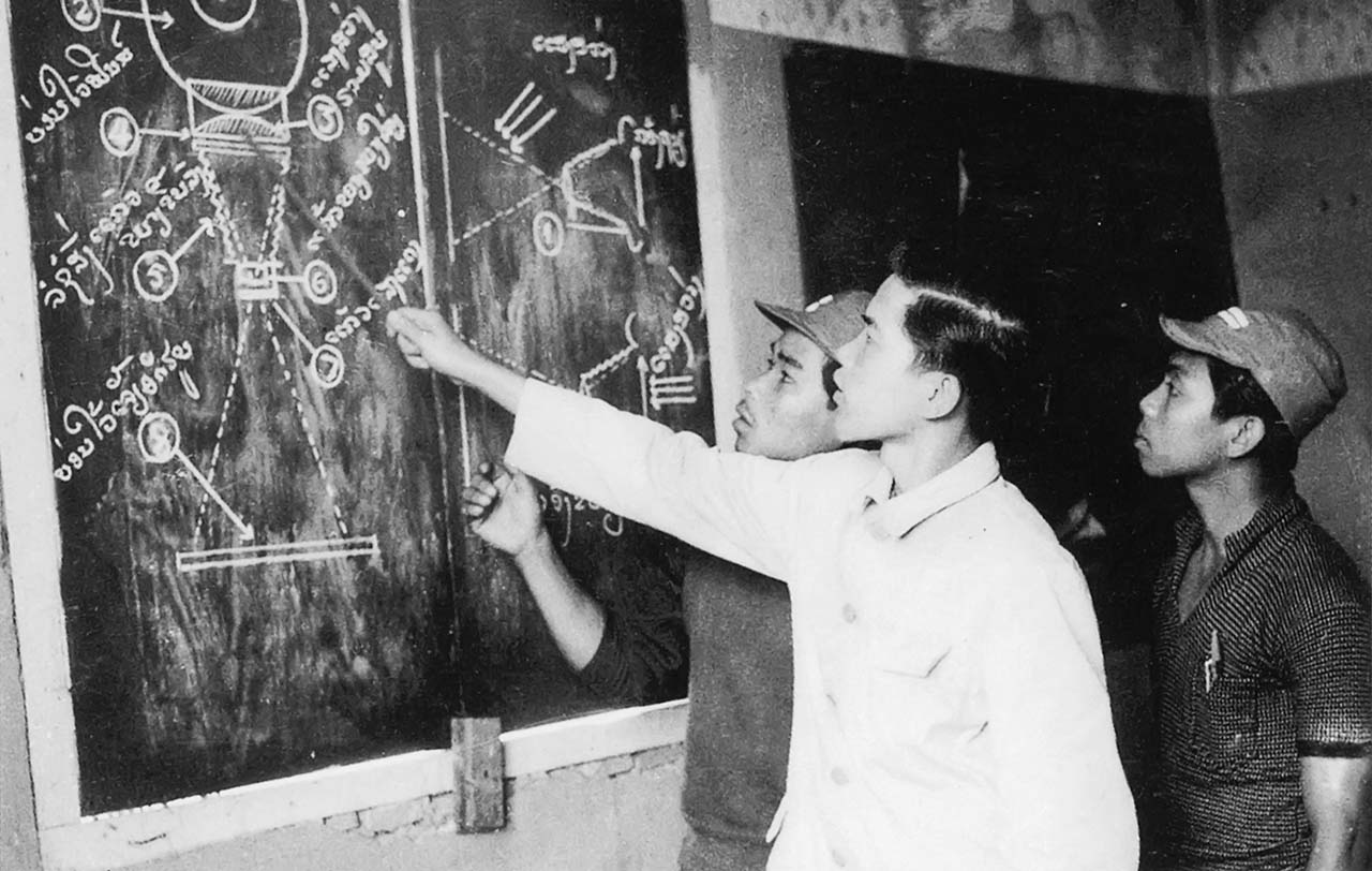 | Chuyên gia VNTTX Hoàng Kim Hùng (người mặc áo trắng) đang hướng dẫn các bạn Lào về cấu tạo máy phóng ảnh, tháng 3/1961 |