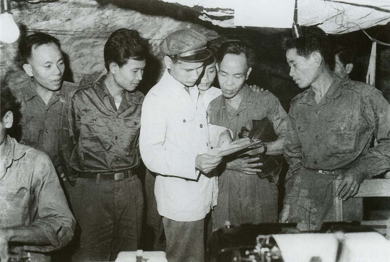 | Phóng viên VNTTX và KPL xem bản tin mới nhận, năm 1972 |