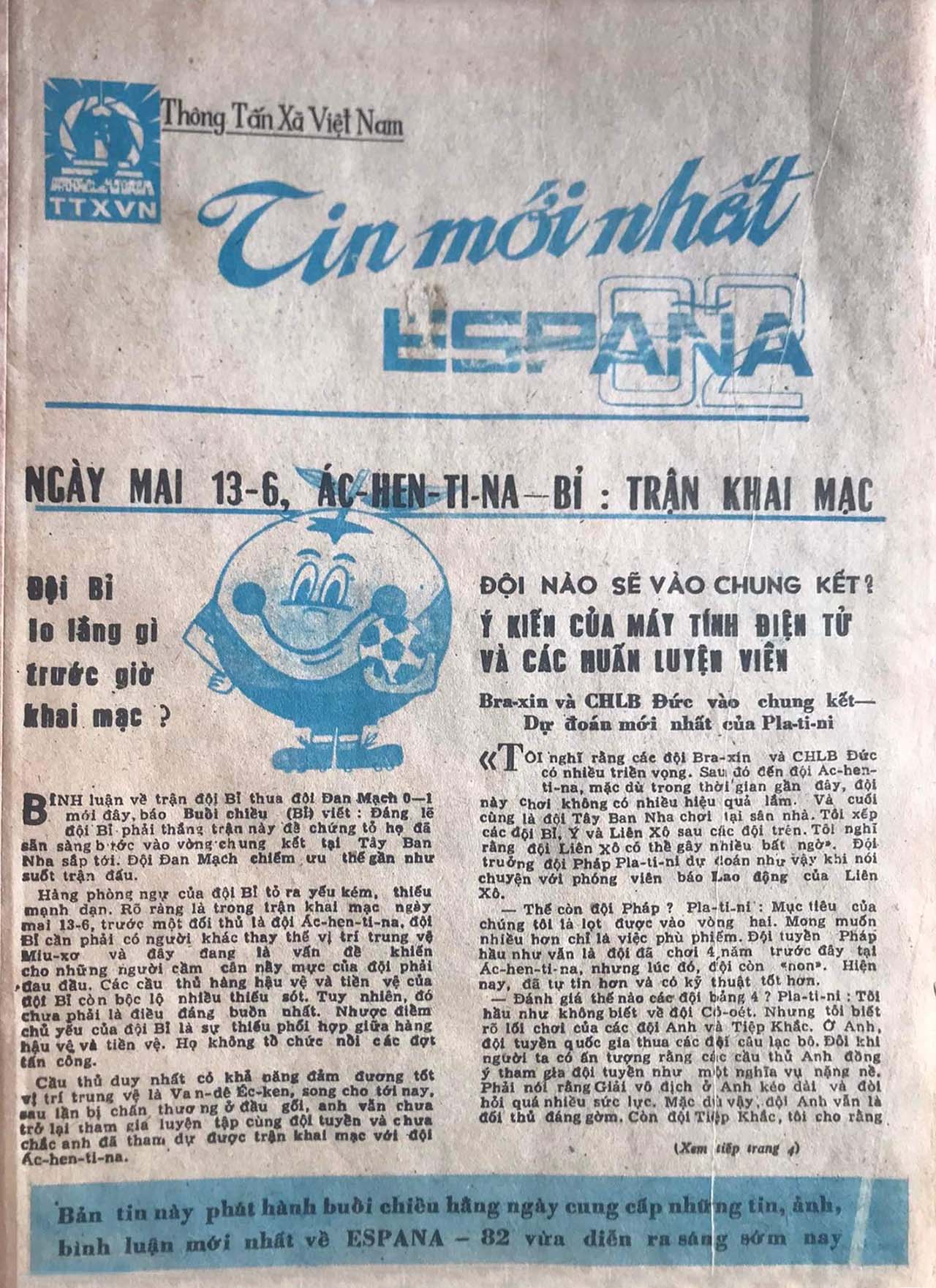Tin mới nhất Espana 82 đặt tại Ban biên tập tin Thế giới. Tôi được Bộ biên tập biệt phái làm Thư ký tòa soạn. Nội dung diễn biến 52 trận đấu, những câu chuyện trong và ngoài sân cỏ, bình luận của các cây bút thể thao nổi tiếng thế giới được Ban biên tập tin Thế giới và phân xã TTXVN tại các nước dịch rất đầy đủ. Tôi có trách nhiệm tập hợp bài vở, lên trang từng số rồi chuyển xưởng in. Ngày đó, TTXVN chưa có nhà in, mới có xưởng in typo để in bản tin đặt ngay tại trụ sở 5 Lý Thường Kiệt, Hà Nội. Việc bán báo do Phòng phát hành đảm nhiệm.
