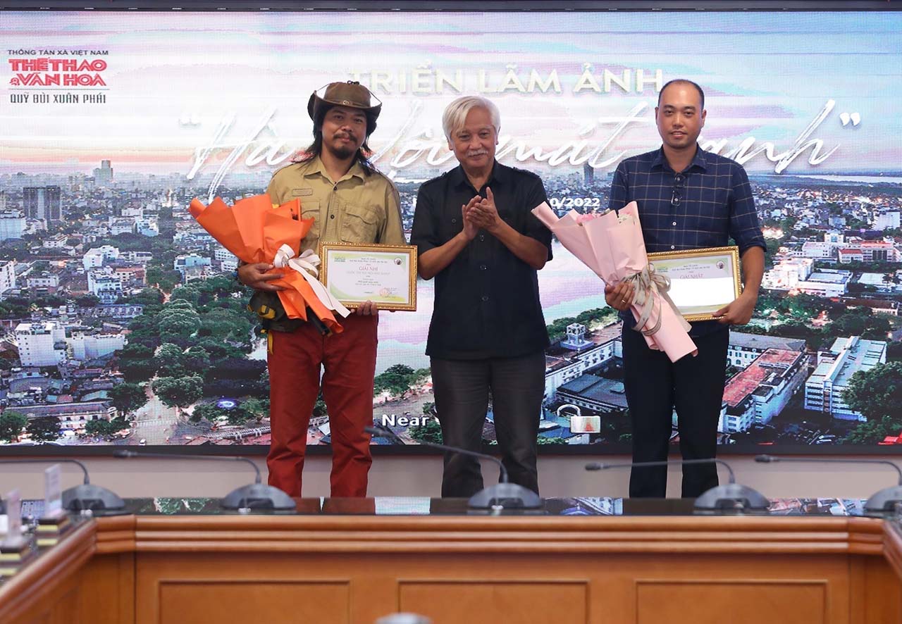 | Nhà sử học Dương Trung Quốc, Phó chủ tịch Hội sử học Việt Nam trao giải Nhất cho tác giả Vũ Minh Đức (bên phải) với tác phẩm "Những “lá phổi xanh” của Hà Nội nhìn từ trên cao" và trao giải Nhì cho tác giả An Thành Đạt với tác phẩm “Phố xanh mùa nhớ” |