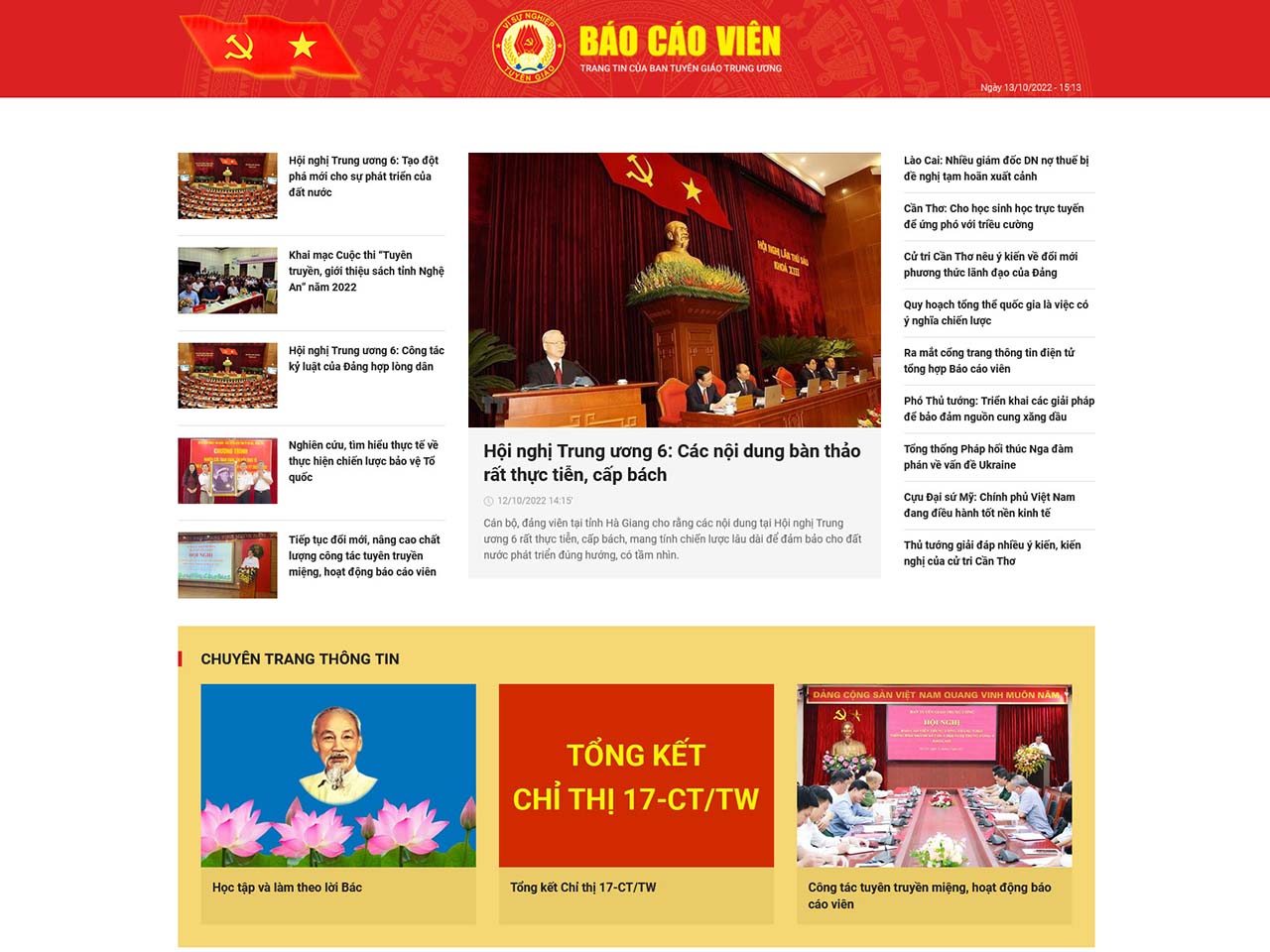Sáng 13/10, tại Hà Nội, Ban Tuyên giáo Trung ương tổ chức lễ khai trương Trang thông tin điện tử tổng hợp Báo cáo viên tại địa chỉ https://baocaovien.vn. Trang thông tin được xây dựng trên cơ sở nguồn thông tin tư liệu của Thông tấn xã Việt Nam (TTXVN), ứng dụng Thông tin Tuyên giáo và các nguồn tin chính thống được liên kết với website của các ban, bộ, ngành, địa phương.