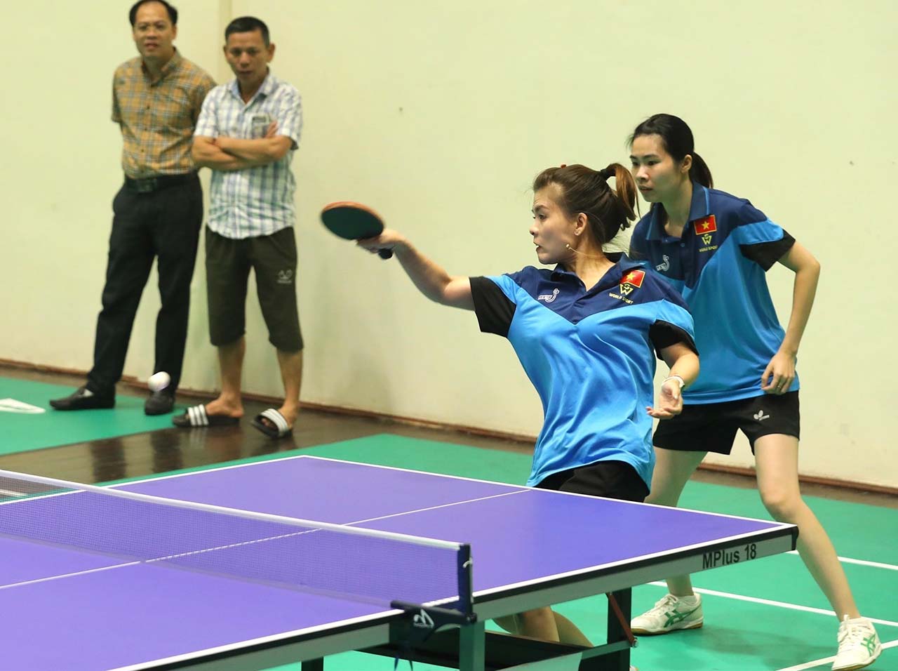 | Cặp VĐV của TTXVN Mai Thanh Tú và Đinh Thu Hà trong trận chung kết nội dung bóng bàn đôi nữ |