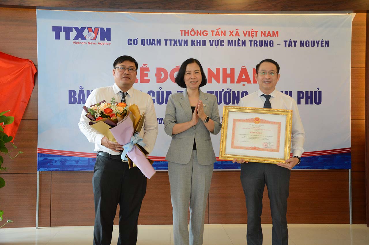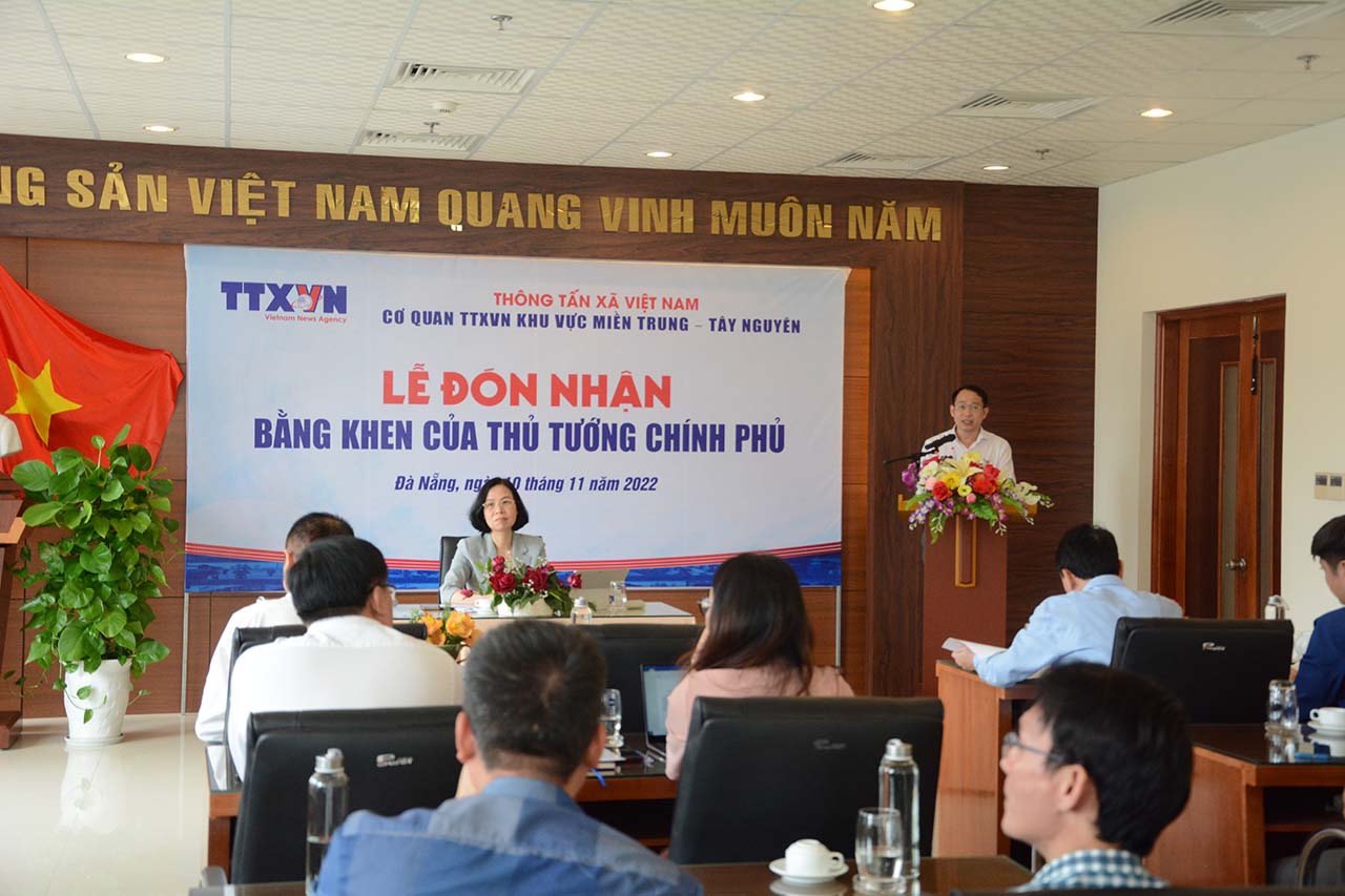 Sáng 10/11, tại Đà Nẵng, Tổng giám đốc Thông tấn xã Việt Nam (TTXVN) Vũ Việt Trang đã trao Bằng khen của Thủ tướng Chính phủ tặng Cơ quan TTXVN khu vực miền Trung - Tây Nguyên vì đã có thành tích trong công tác từ năm 2017 đến năm 2021, góp phần vào sự nghiệp xây dựng chủ nghĩa xã hội và bảo vệ Tổ quốc.