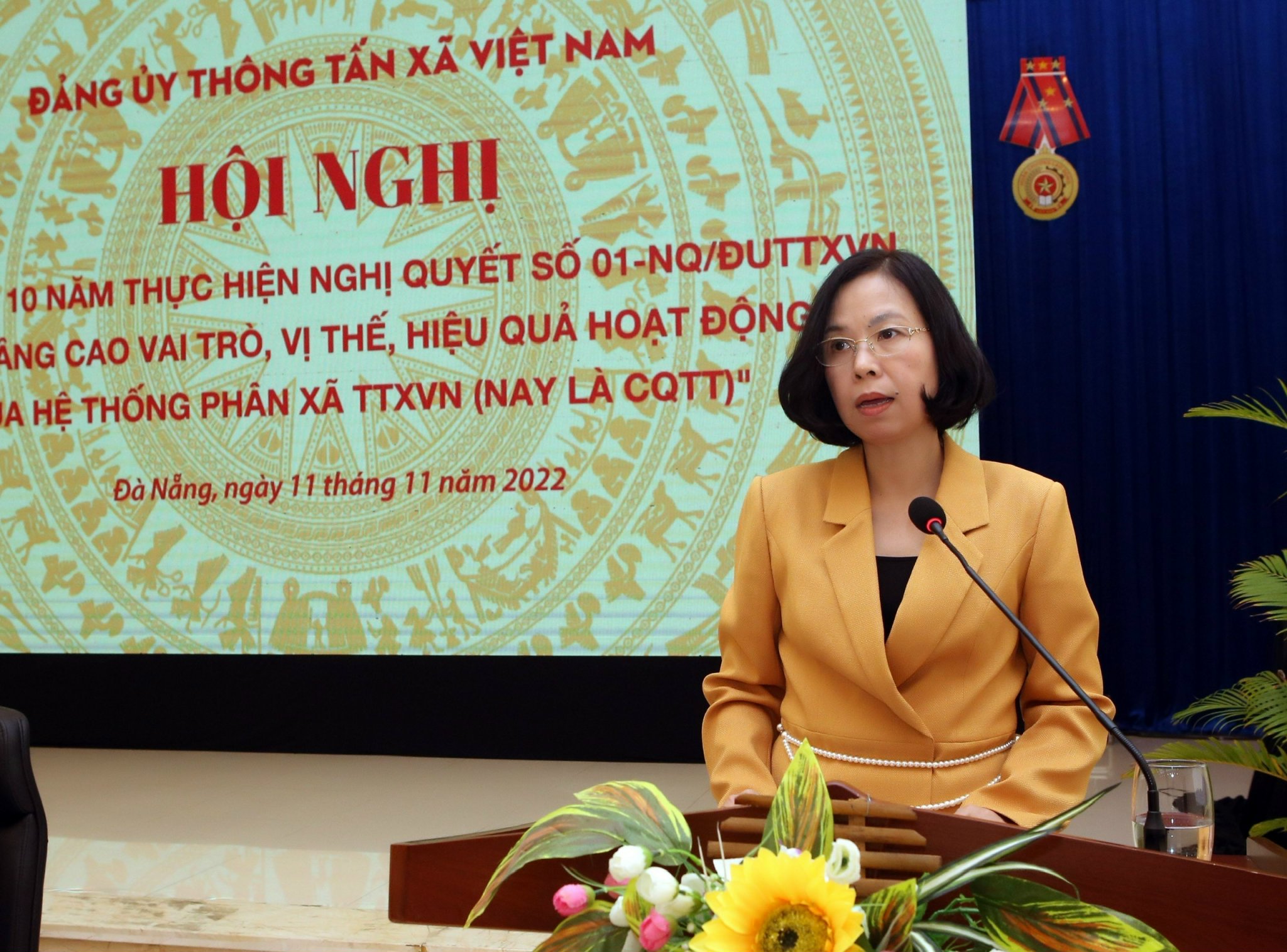 Trình bày báo cáo tổng kết 10 năm thực hiện Nghị quyết số 01-NQ/ĐUTTXVN, ngày 28/5/2012, của Đảng ủy TTXVN về “Nâng cao vai trò, vị thế và hiệu quả hoạt động của hệ thống phân xã Thông tấn xã Việt Nam (nay là cơ quan thường trú)”, Phó bí thư chuyên trách Đảng ủy TTXVN Hà Thị Mai An cho biết, hiện TTXVN có 63 CQTT trong nước với 190 phóng viên và 30 CQTT ngoài nước với 79 phóng viên. Các CQTT trong và ngoài nước thực hiện hai chức năng chính: công tác thông tin và đại diện TTXVN tại địa bàn thường trú.