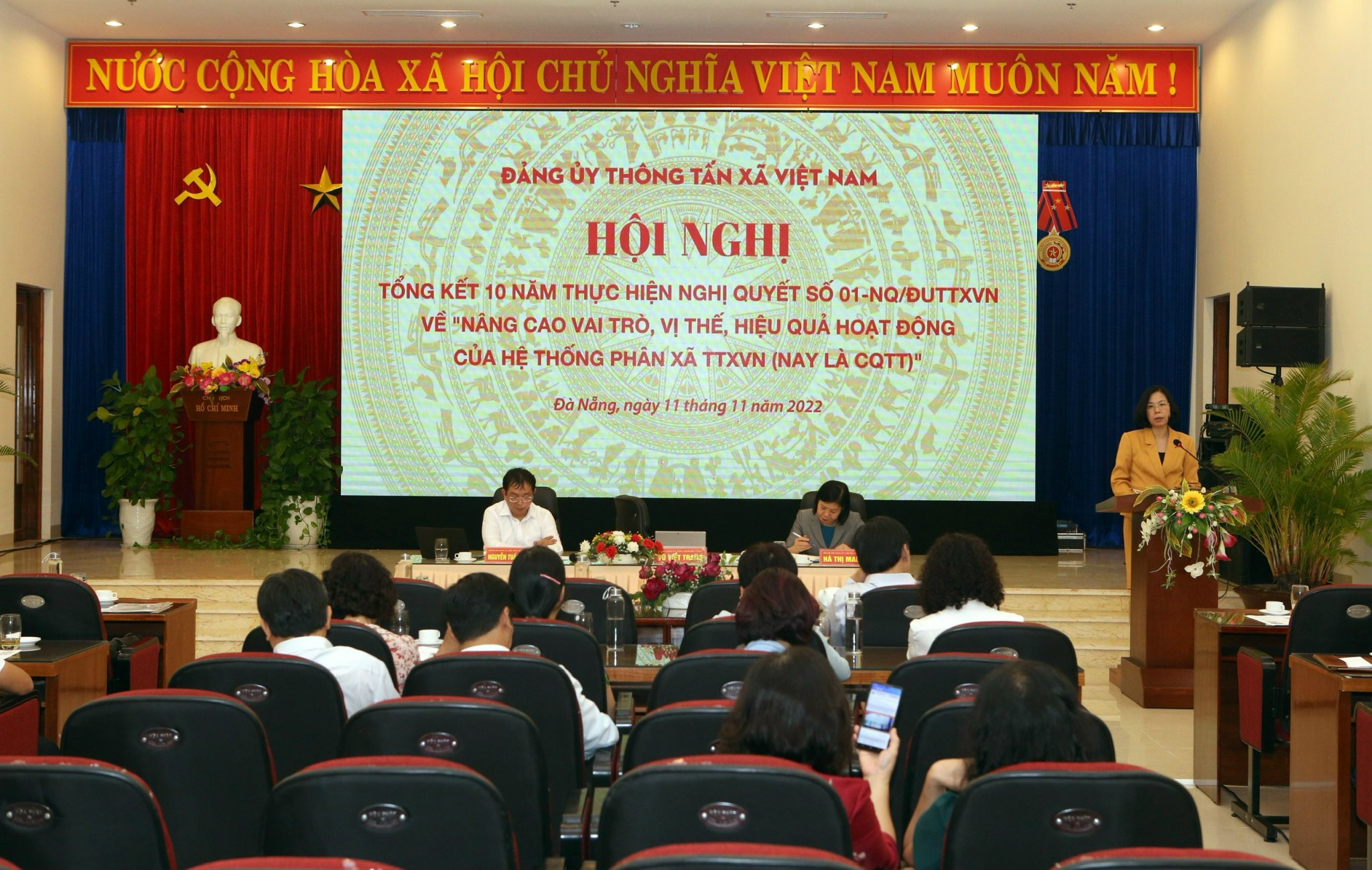 Chiều 11/11, Hội nghị tổng kết 10 năm thực hiện Nghị quyết số 01-NQ/ĐUTTXVN, ngày 28/5/2012, của Đảng ủy Thông tấn xã Việt Nam (TTXVN) về “Nâng cao vai trò, vị thế và hiệu quả hoạt động của hệ thống phân xã Thông tấn xã Việt Nam (nay là cơ quan thường trú)” đã được tổ chức tại thành phố Đà Nẵng. Bí thư Đảng ủy, Tổng giám đốc TTXVN Vũ Việt Trang; Phó bí thư Đảng ủy, Phó tổng giám đốc Nguyễn Tuấn Hùng; Phó bí thư chuyên trách Đảng ủy Hà Thị Mai An chủ trì hội nghị.
