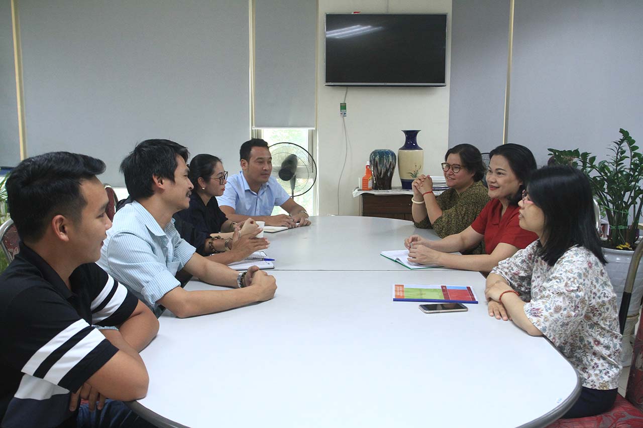 | Trưởng ban biên tập tin Trong nước Nguyễn Thị Sự (giữa, bên phải) trao đổi nghiệp vụ với phóng viên các CQTT trong nước |
