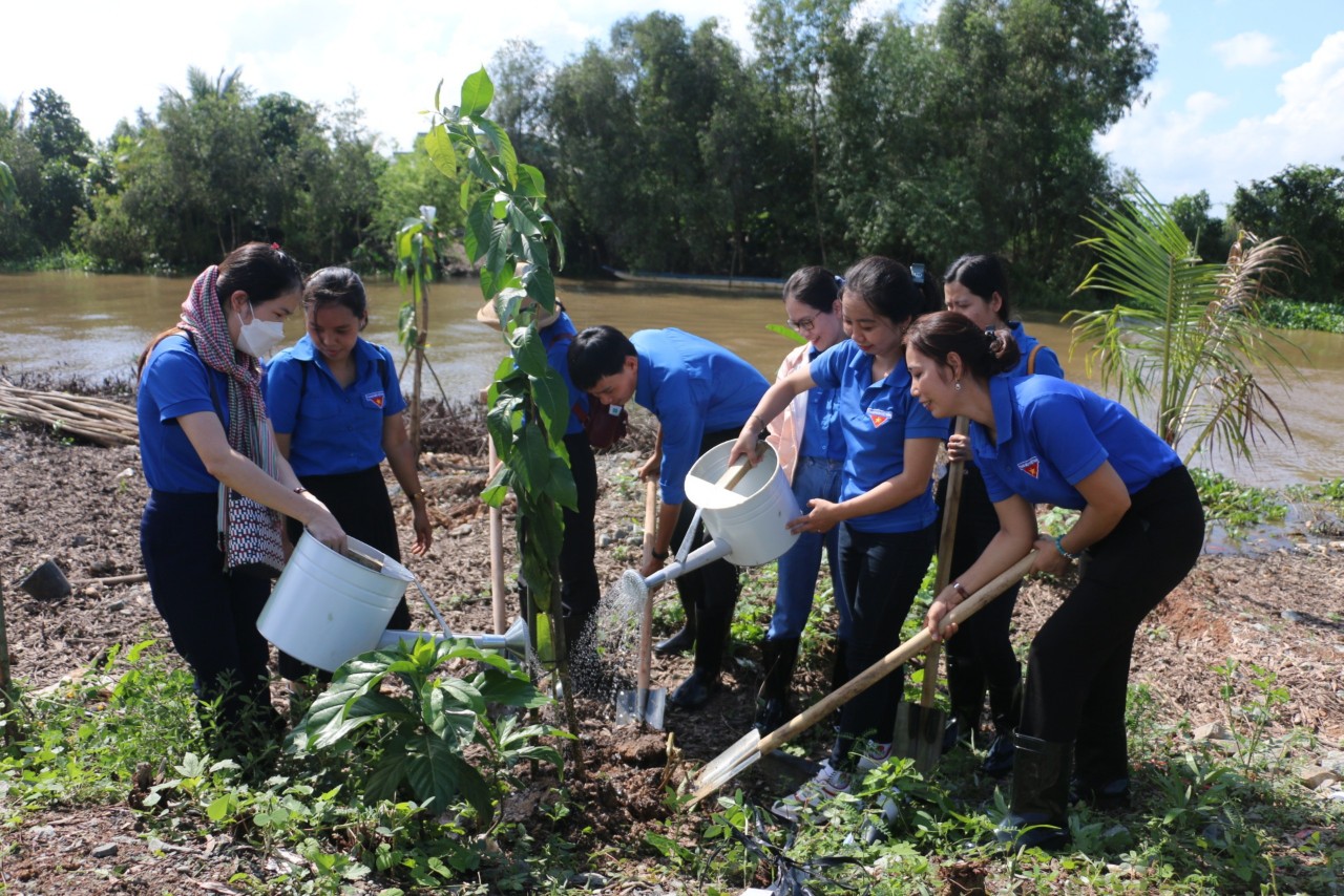 | Đoàn viên thanh niên TTXVN trồng cây xanh tại xã Nhơn Hòa, huyện Tân Thạnh, tỉnh Long An |