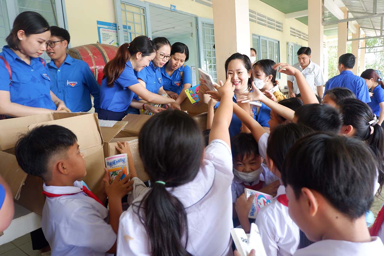 | Học sinh trường Trường tiểu học Nhơn Hòa, huyện Tân Thạnh, tỉnh Long An hào hứng đón nhận những cuốn sách mới |
