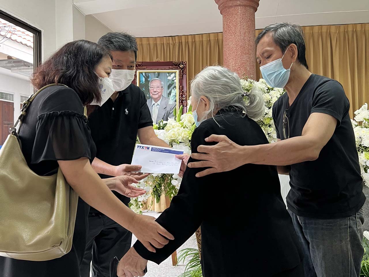 | Trưởng CQTT TTXVN tại Bangkok Nguyễn Thị Đỗ Sinh chia buồn với gia đình nhà báo lão thành Châu Kim Quới, ngày 26/11 |