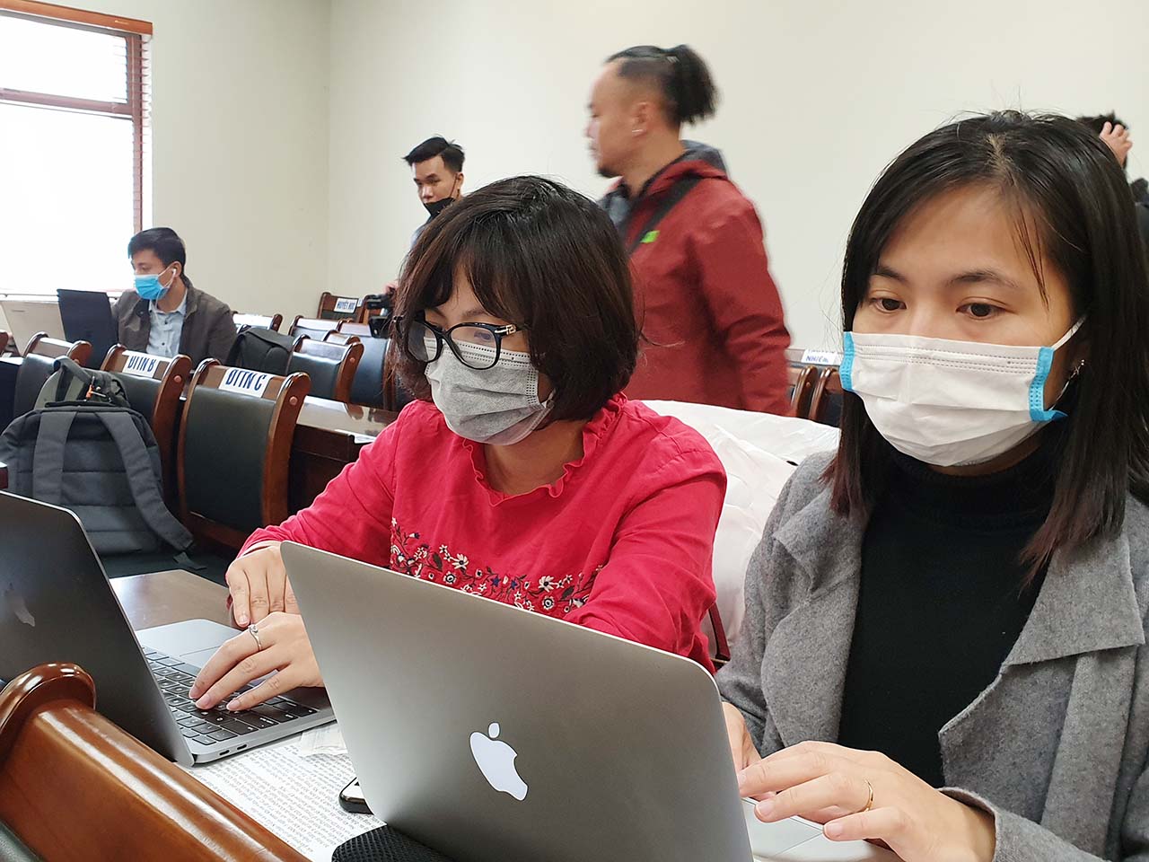 Phóng viên Cao Thùy Giang (bìa phải), tác nghiệp trong đợt cao điểm phòng, chống dịch COVID-19 tại bệnh viện Nhi Trung ương, Hà Nội