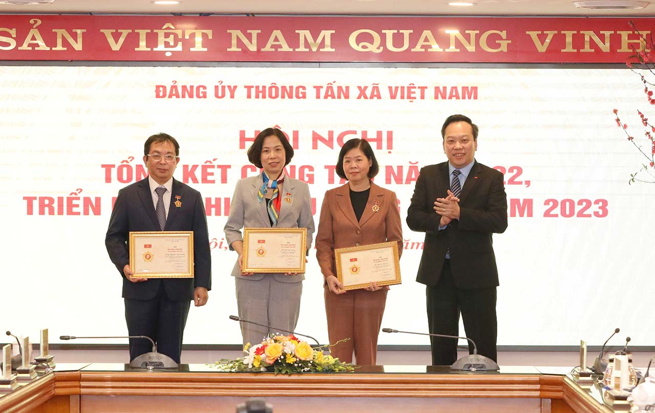 | Đồng chí Đỗ Việt Hà, Phó bí thư Đảng ủy Khối các cơ quan Trung ương, chúc mừng các đồng chí: Tổng giám đốc Vũ Việt Trang, Phó tổng giám đốc Nguyễn Tuấn Hùng và Phó bí thư Đảng ủy chuyên trách Hà Thị Mai An được trao tặng Kỷ niệm chương Vì sự nghiệp Dân vận, tháng 1/2023 |