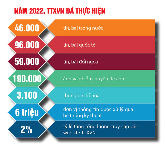 * Thực hiện hiệu quả Nghị định số 87/2022/NĐ-CP quy định chức năng, nhiệm vụ, quyền hạn và cơ cấu tổ chức của TTXVN; sắp xếp tổ chức bộ máy, đảm bảo tinh gọn, hoạt động hiệu lực, hiệu quả; bổ sung, kiện toàn nhân sự lãnh đạo ngành.