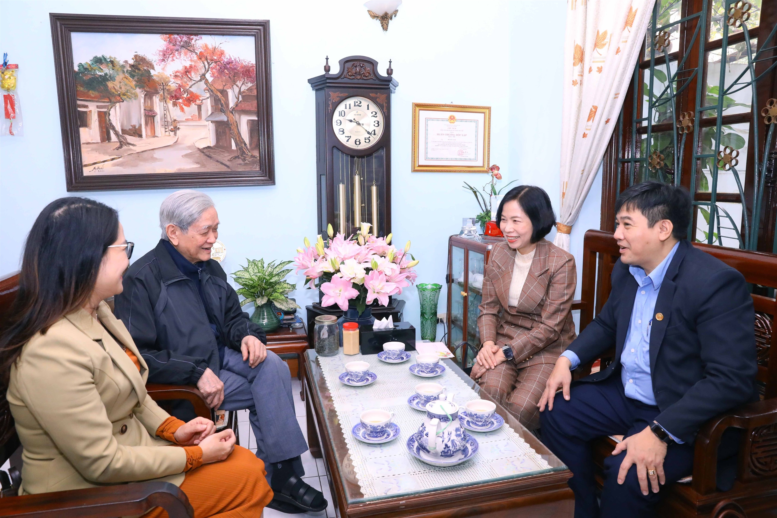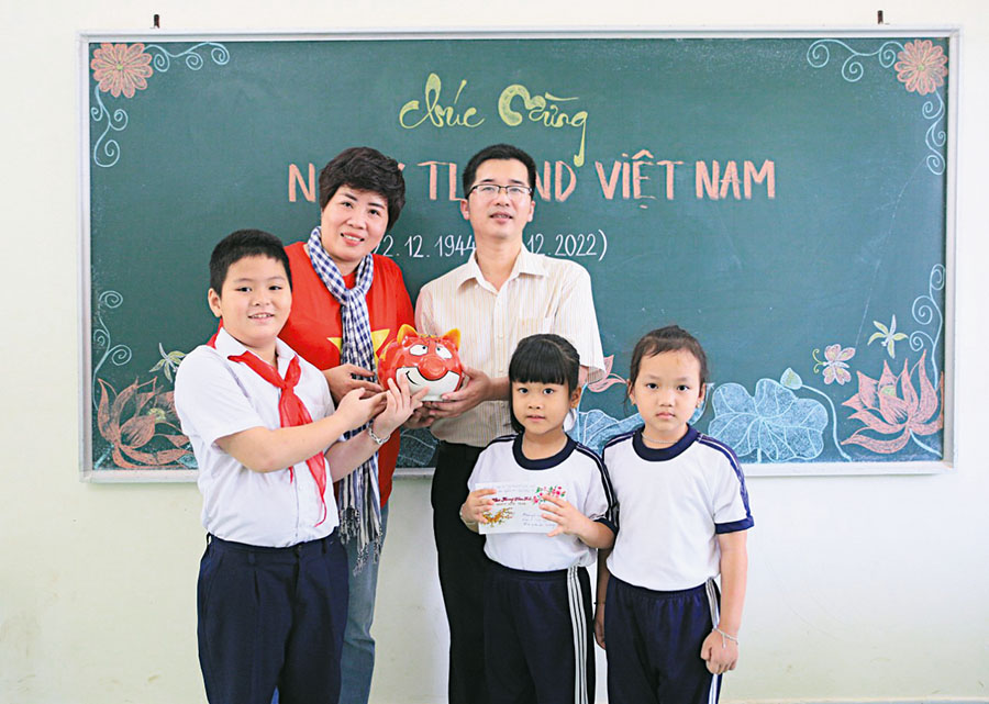 | Phóng viên Nguyễn Cúc trao con lợn đất – món quà của học sinh Thủ đô tặng thầy và trò trường Tiểu học Trường Sa, tháng 1/2023 |