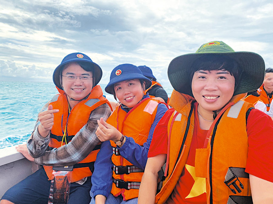 | Phóng viên Nguyễn Cúc (ngoài cùng bên phải), Cơ quan thường trú Thông tấn xã Việt Nam tại Hà Nội, trên xuồng vào đảo Đá Đông C, Trường Sa, tháng 1/2023 |