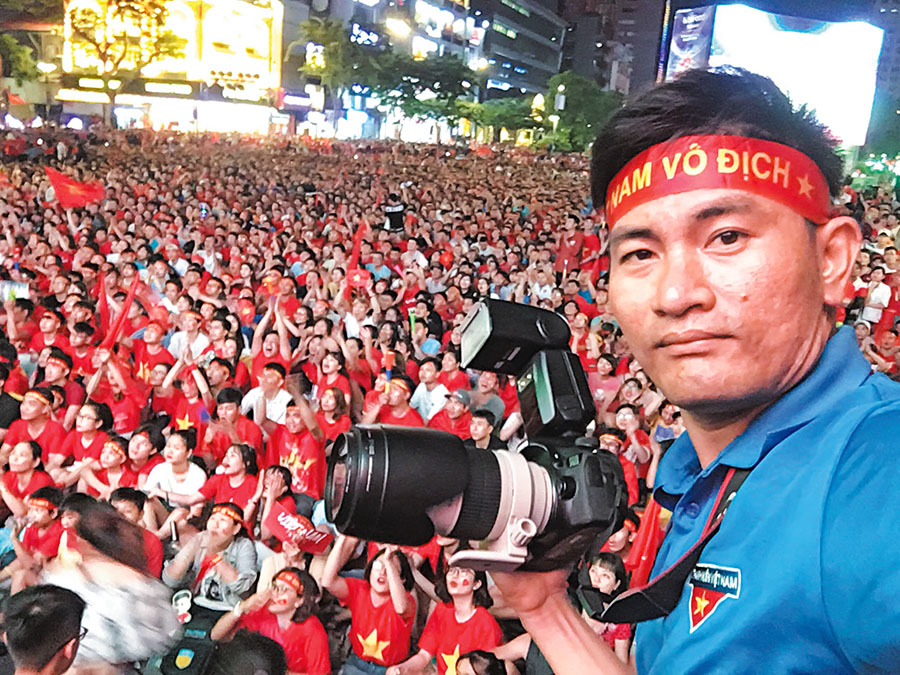Phóng viên Báo ảnh Việt Nam Sơn Nghĩa cùng các cổ động viên cổ vũ đội tuyển Việt Nam tại Giải AFF Cup 2018, trên phố đi bộ Nguyễn Huệ, Quận 1, TP. Hồ Chí Minh
