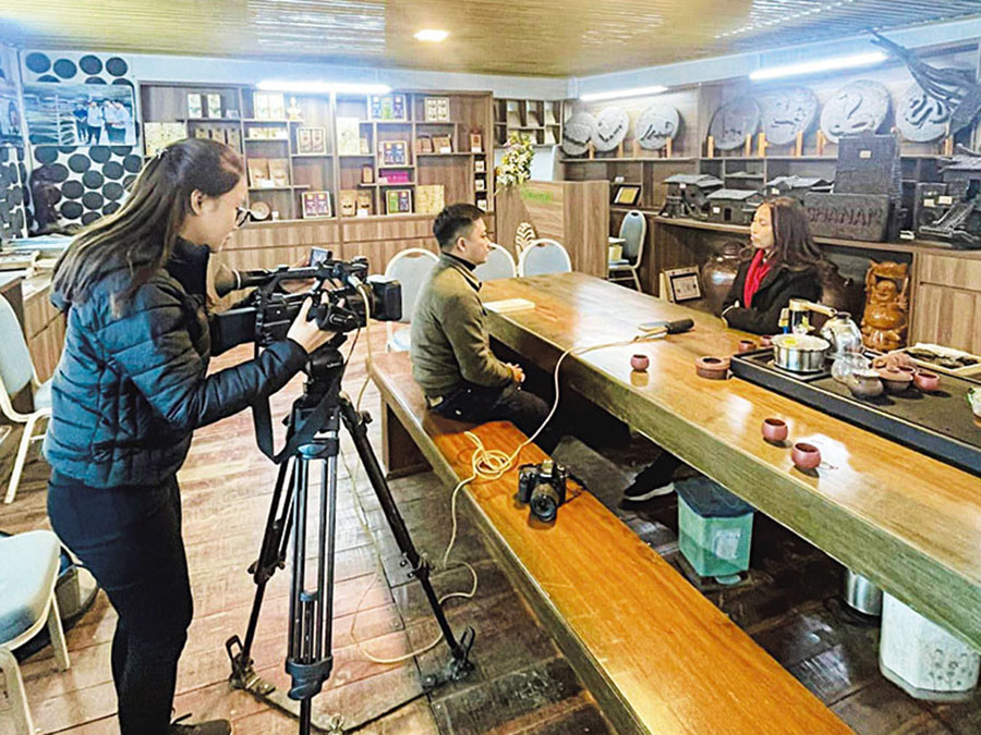 | Phóng viên Lê Hữu Quyết, CQTT Sơn La, phỏng vấn doanh nghiệp trà Tây Bắc, tháng 12/2022 |